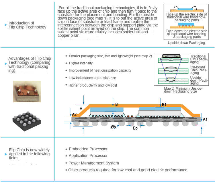 ●Traditional packaging technologies normally make the active side of the chip face upside, and its back faces to substrate or frame for mounting and bonding; while Flip Chip packaging technology( see figure 1) makes the active side of the chip face towards substrate or frame, to realize interconnection between the chip and the substrate via the soldering salient points on the chip which is in array arrangement.The common salient point structure mainly includes the two types of solder ball and copper pillar.